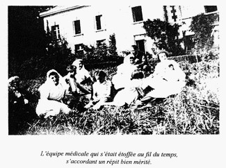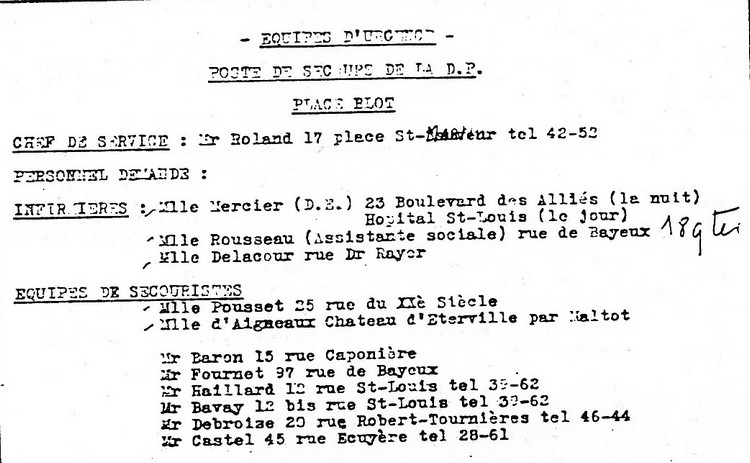 Directrice Mme Chapel directeur adjoint M. Chapel de la DP, trois médecins (docteurs Friley, Guesdon et Fontaine), neuf infirmières ou élèves, infirmière-major Mme Fauveau (septuagénaire !), une vingtaine de brancardiers et secouristes (dont Michel, Pernot, Prudhomme, Duprat, Hazet), infirmier-major M. Mutel et deux ambulancières avec leur ambulance. Au total 25 à 30 personnes.