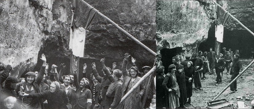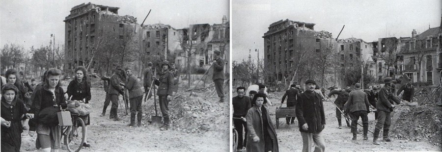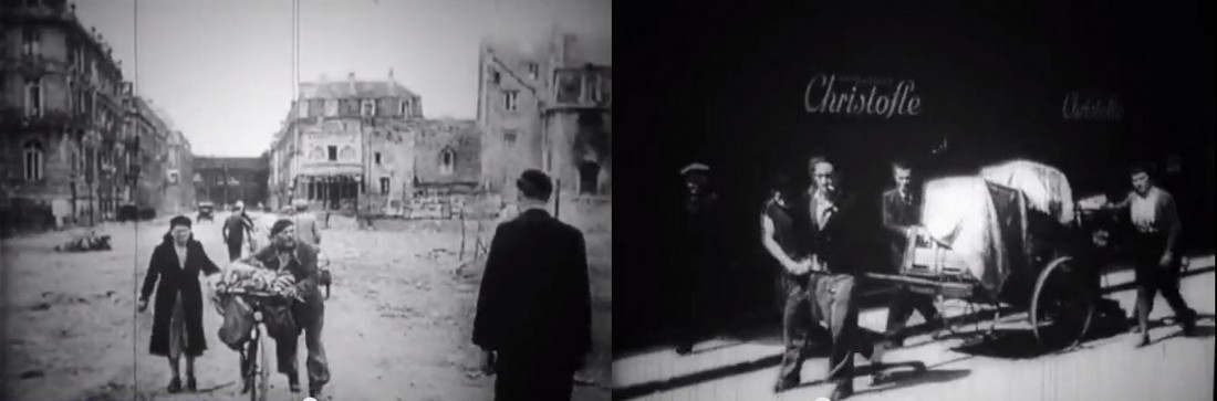 A gauche: photo "collections du Mémorial de Caen", source: page 49 de ce livre. A droite: "Photo Jean Quellien" source: page 80 de ce livre.