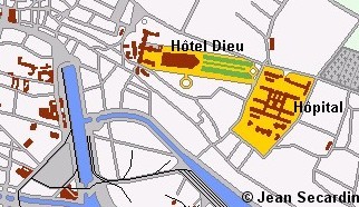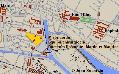 a communauté de la Miséricorde occupe le terrain compris entre la rue des Carmes, (entrée principale de la communauté et de la première clinique, l'hôpital provisoire), la place Singer (groupant la Chapelle et la Clinique du Sacré-Cœur et la place d'Armes (où se trouve le dispensaire transformé en hôpital depuis 1940, les équipes chirurgicales des docteurs Dastugue, Martin et Morice.