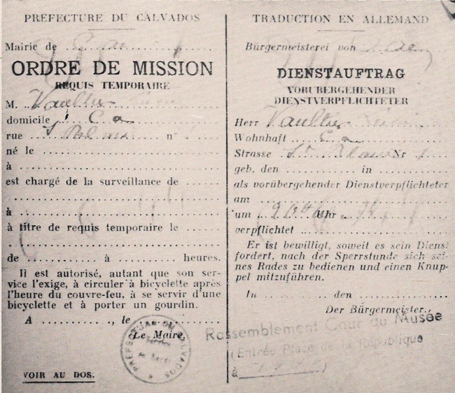 « Le Préfet et le maire de Caen avertissent que, par ordre des autorités allemandes, la population de Caen doit quitter la ville, à partir de 5 heures du matin, le mercredi 14 juin, pour gagner Trun dans l’Orne »